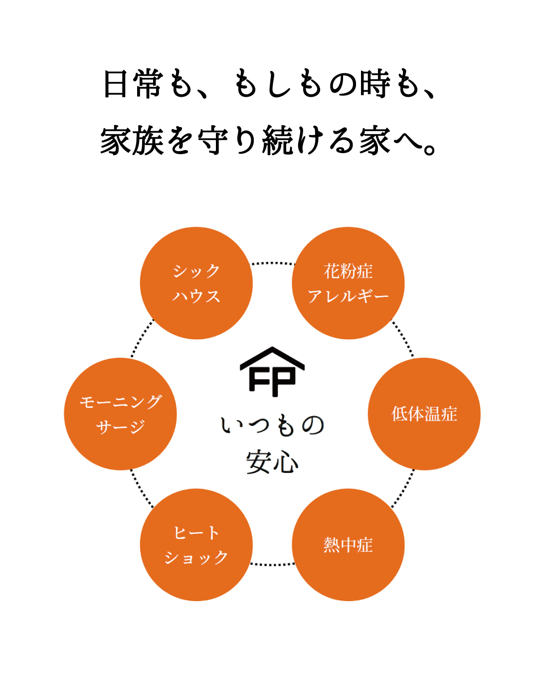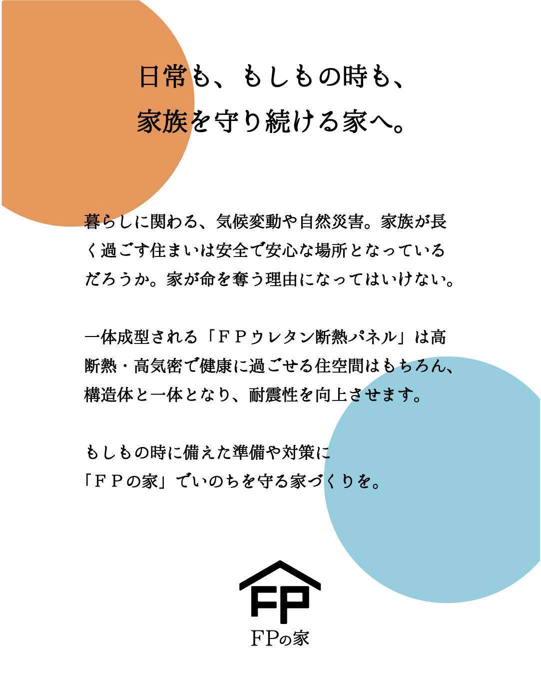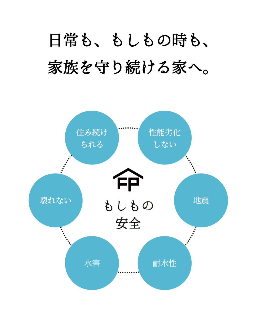 「FPの家」は、長年培ってきた技術力を活かし、住環境を整えることはもちろん、日常生活におけるリスク、そして予測不能な災害から家族を守るという新たな視点をベースとした家づくりを行ってまいります。