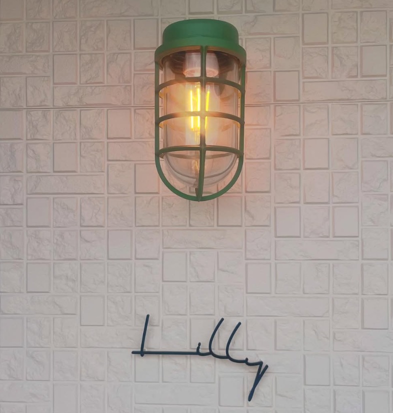 水色の玄関ドアがと照明が可愛いです。